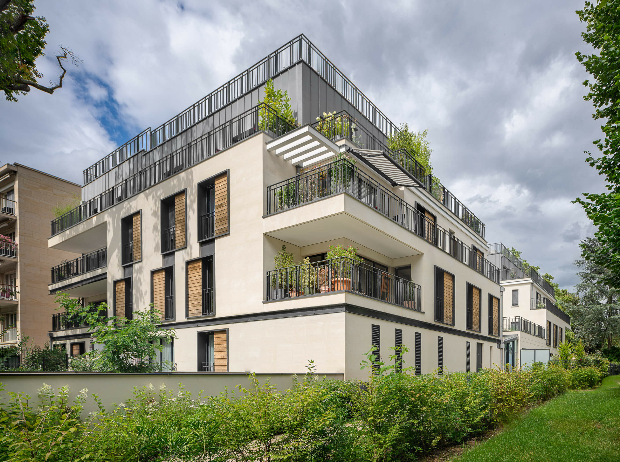 L’approche photographique a mis en valeur la géométrie claire du bâtiment. Jeux de matières, percées visuelles, balcons en creux. J’ai capté les vues filtrées à travers les jardins collectifs, pour raconter la relation entre l’architecture et son environnement immédiat. Ce projet mêle sobriété urbaine et élégance contemporaine.